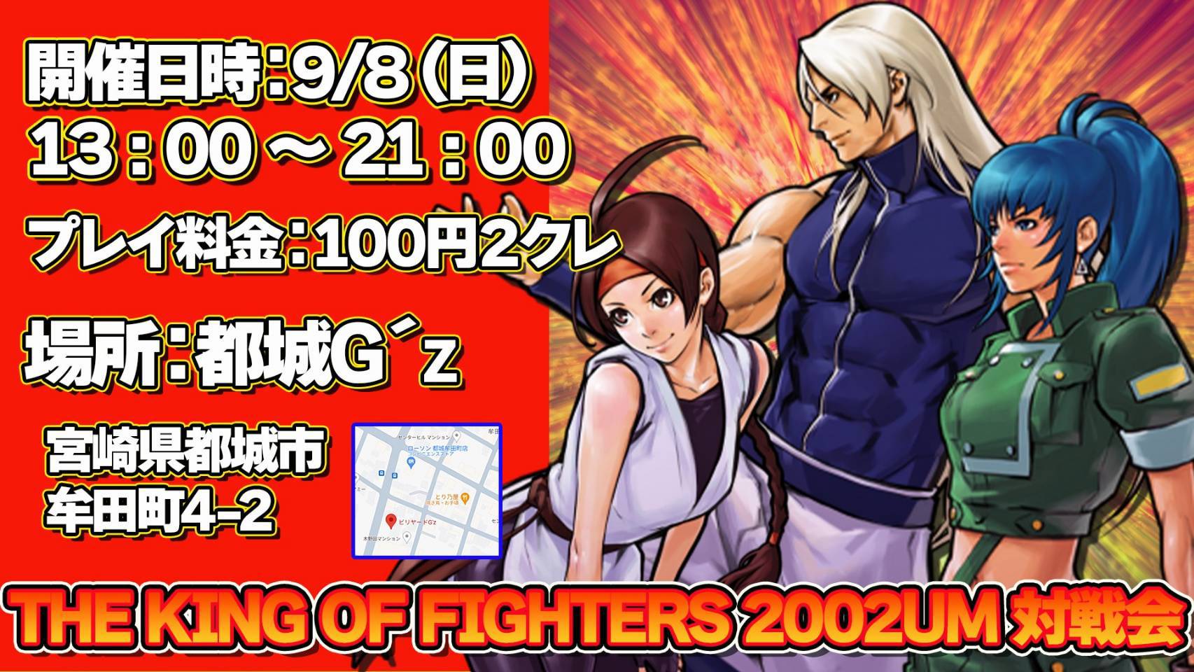 宮崎県都城市のゲームセンター、ビリヤードG’z様で、KOF2002UMの配信対戦会が開催されてます。